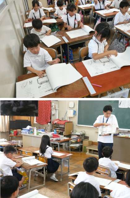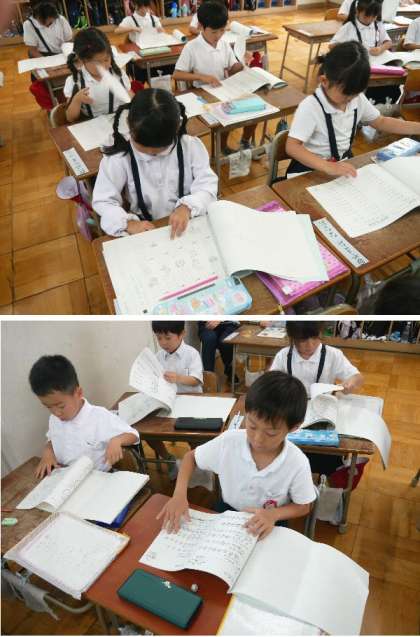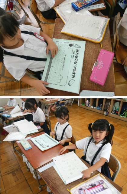 1年生では、夏休みの宿題のプリントが配布され、中身を確認していました。