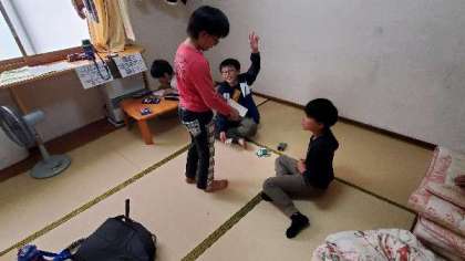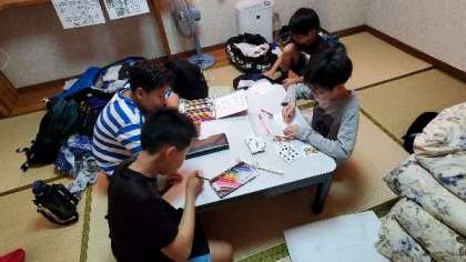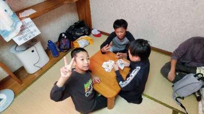 魚つかみが終わり、宿舎にもどって、お風呂に入ります。その間、部屋でハガキを書いたり、トランプしたりしています。