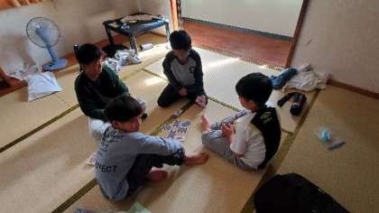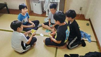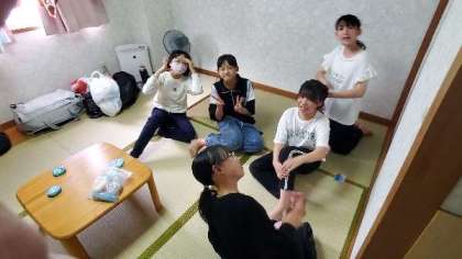 部屋でゆっくりしています。お風呂を順に入ってます。男子の人数が女子の倍なので、今日は早めにゆっくり入ります。