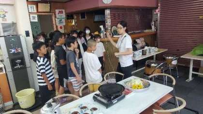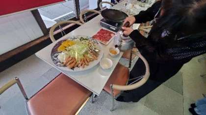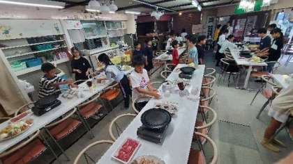 夕食の時間です。食事係が準備をしています。今日は焼き肉です。