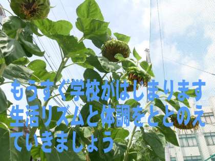 来週から2学期がはじまります。生活のリズムを整えて、体調を良好にしておいてくださいね。27日の始業式に笑顔でお会いできるのを楽しみにしています。
