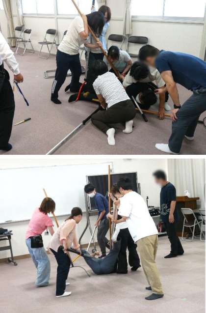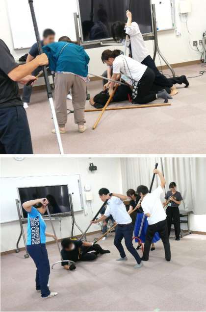 2学期には、不審者対応の避難訓練を予定しています。事前に先生がたが不審者対応の実践的な訓練を行いました。都島警察署の方に来ていただき、実際に不審者にふんしていただき、先生方でさすまたで取り押さえる訓練をしました。警察の方の迫力ある行動に負けずに必死に取り組みました。