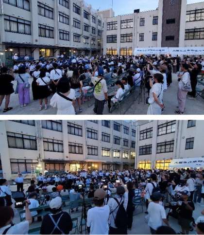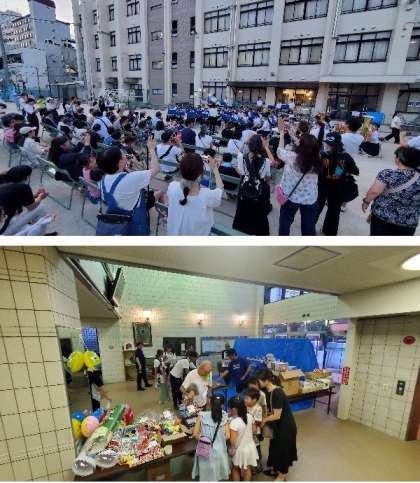 夏休み最後の土曜日、東都島小学校の運動場を会場として、地域のふれあいフェスティバルが開催されました。桜宮中学校の吹奏楽部が演奏にきてくれて盛り上げてくれました。