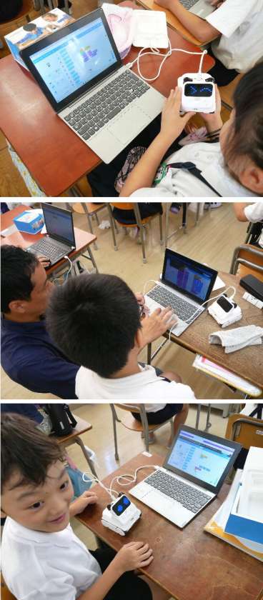 3年生では、教育センターから貸し出したロボットカー「コーディーロッキー」を学習端末のパソコンに接続して、作ったプログラミングをアップロードしてロボットカーを動作させます。顔の液晶パネルにいろいろな表示や音がでたり、モーターで動いたりします。