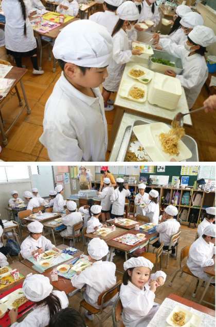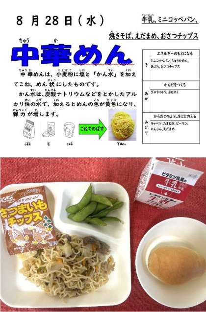 今日の献立は、焼きそば、えだまめ、おさつチップス、牛乳、ミニコッペパンでした。