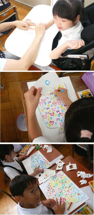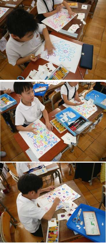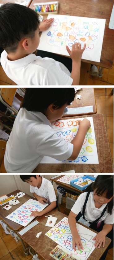 1年生の図工では、型紙を作って、同じ模様をクレヨンで作って、カラフルなパフェを描いていました。