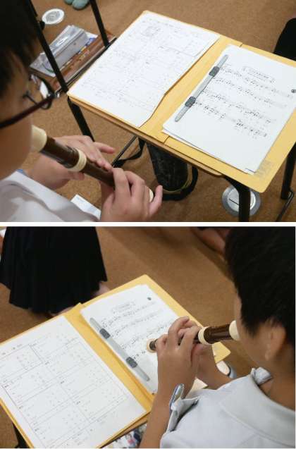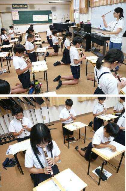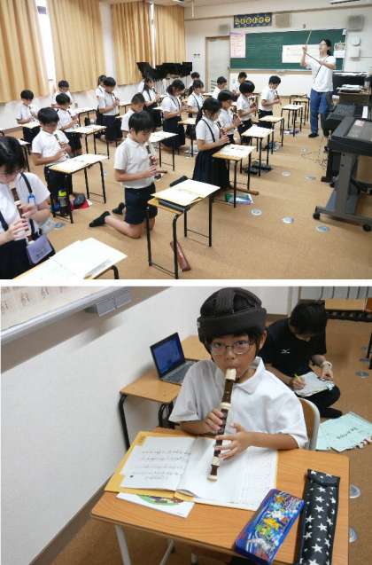 5年生の音楽では、リコーダーの練習をしています。パートを分かれて合奏です。うまくタイミングがあうかな。