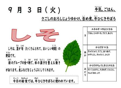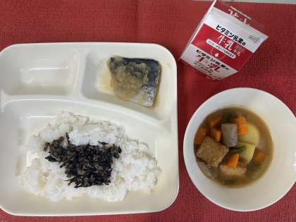 今日の献立は、さごしのおろしじょうゆかけ、含め煮、牛ひじきそぼろ、牛乳、ごはんでした。