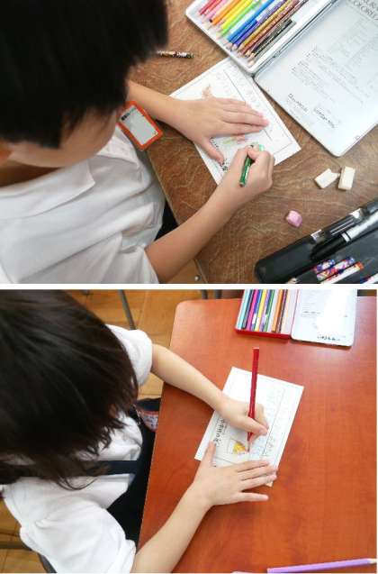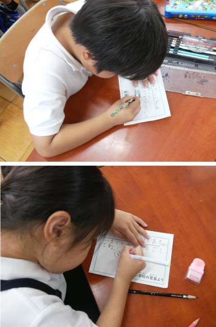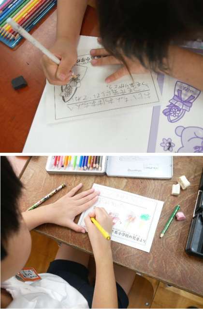 東都島小学校では、地域のお年寄りの方にお渡しするメッセージカードを作っています。2年生が教室でカードにメッセージや絵を描いていました。
