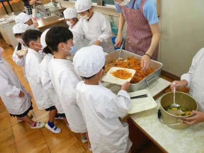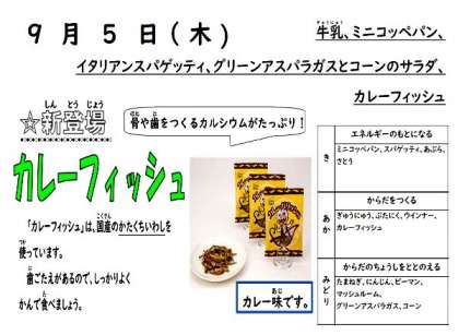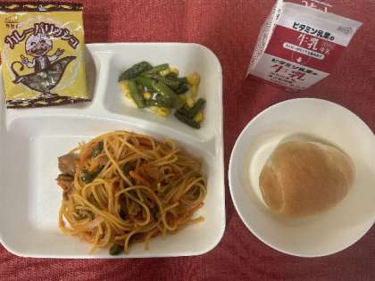 今日の献立は、イタリアンスパゲッティ、グリーンアスパラガスとコーンのサラダ、牛乳、ミニコッペパン、カレーフィッシュ、ミニコッペパンでした。