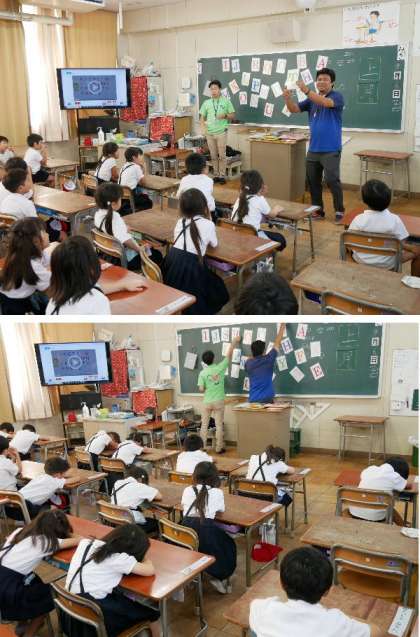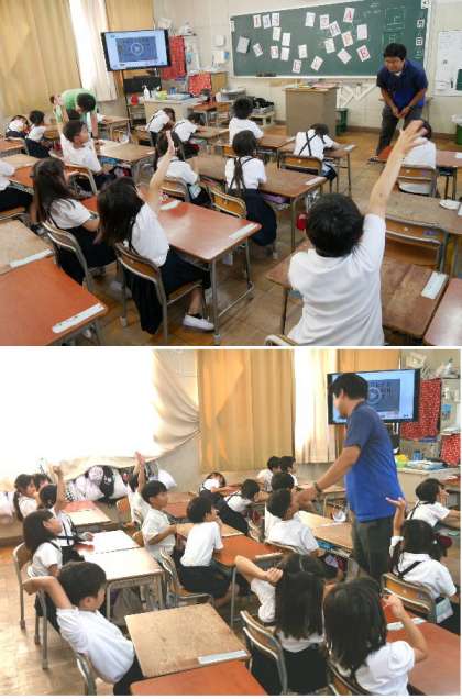 1年生の教室に、ネイティブ英語のトゥリアオ先生が来てくれました。アルファベットの学習をしています。黒板に貼られたアルファベットでなくなったものを答えます。子どもたちは元気いっぱいです。