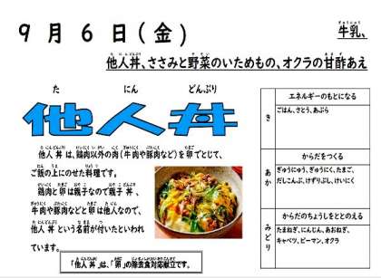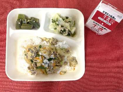 今日の献立は、他人丼、ささみと野菜のいためもの、オクラの甘酢あえ、牛乳でした。