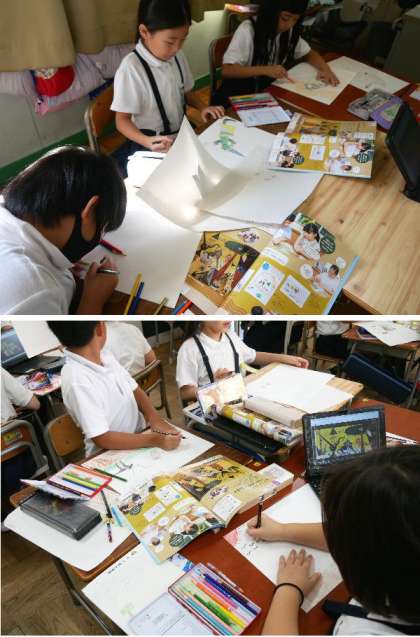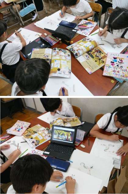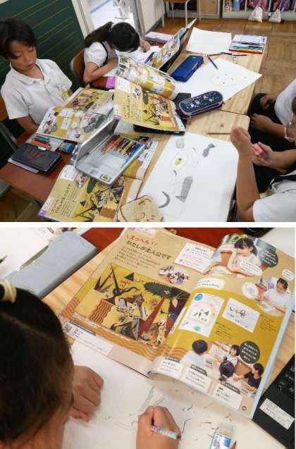 3年の図工では、スペインの画家のミロが描いた「耕作地」という絵にあるふしぎな生き物たちがどのように表されているか見ています。ミロさんの描いた生き物を主人公にして、感じたことや想像したことを描いています。