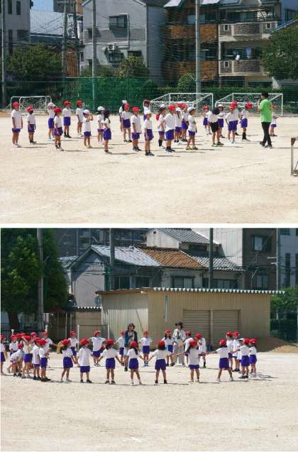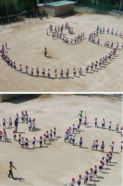 1年生が運動場で、運動会の隊形練習をしています。まだまだ暑いので、短時間でさっと動きを確認しています。