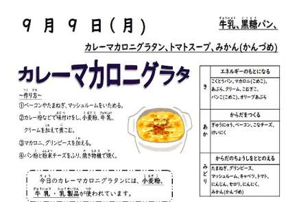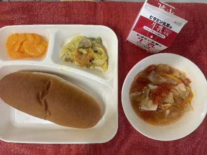 今日の献立は、カレーマカロニグラタン、トマトスープ、みかん(缶)、牛乳、黒糖パンでした。