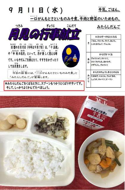 今日の献立は、一口がんもとさといものみそ煮、牛肉と野菜の炒め物、牛乳、ごはん、みたらし団子でした。