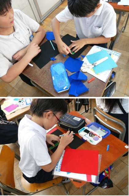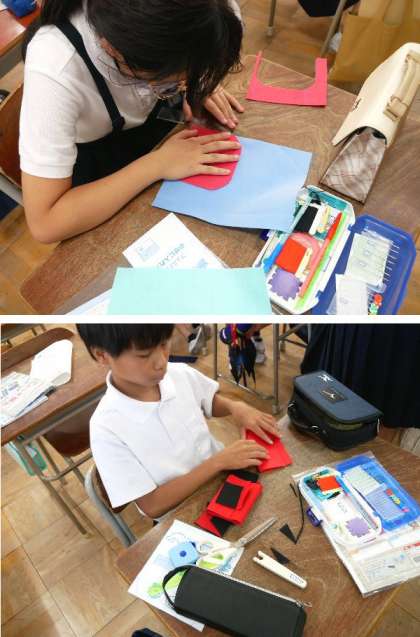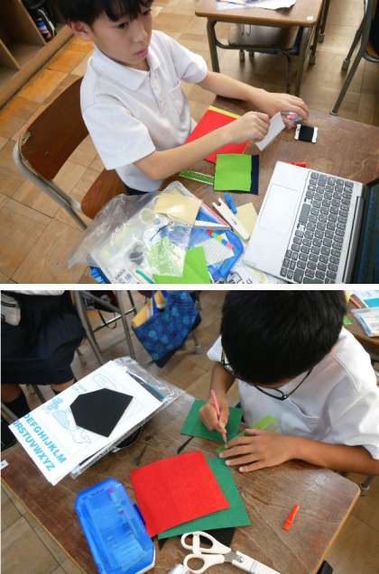 5年生の家庭科では、裁縫の練習をずっとしてきました。習ったことを生かして、フエルト生地での作品づくりです。