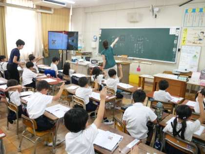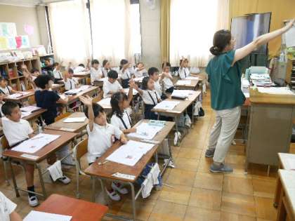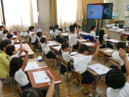 1年生の国語で漢字を書く練習をしています。指でなぞっておぼえます。