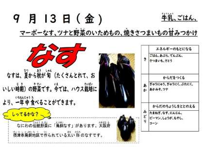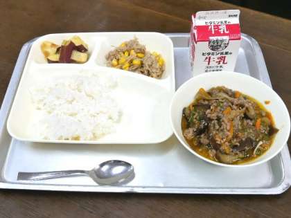 今日の献立は、マーボーなす、ツナと野菜の炒め物、焼きさつまいもの甘みつかけ、牛乳、ごはんでした。