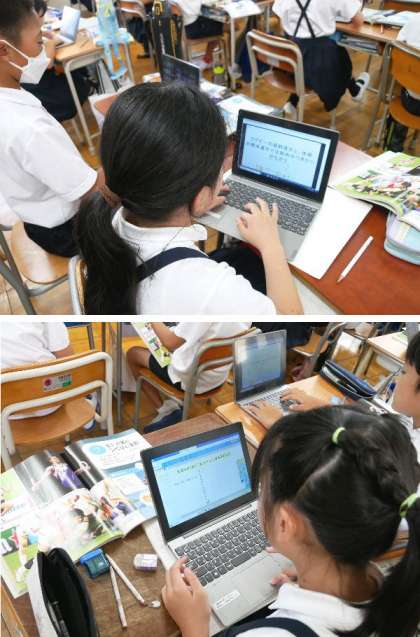 4ねんせいの理科ては、ヒトの体のつくりと運動について学習しています。うでや体を動かしてみて気づいたことをパソコンでまとめています。