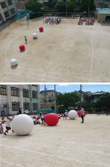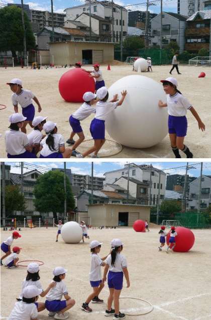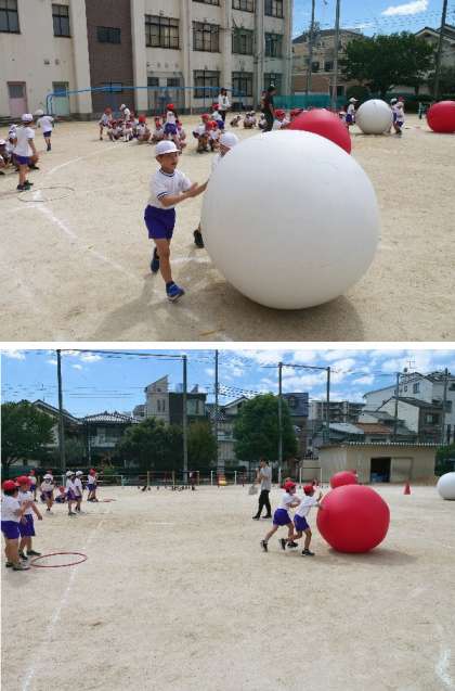 ようやく、涼しくなってきて、運動場での本格的な練習が始まりました。2年生は、団体演技と団体競技の「大玉ころがし」をおこないます。
