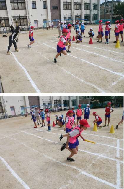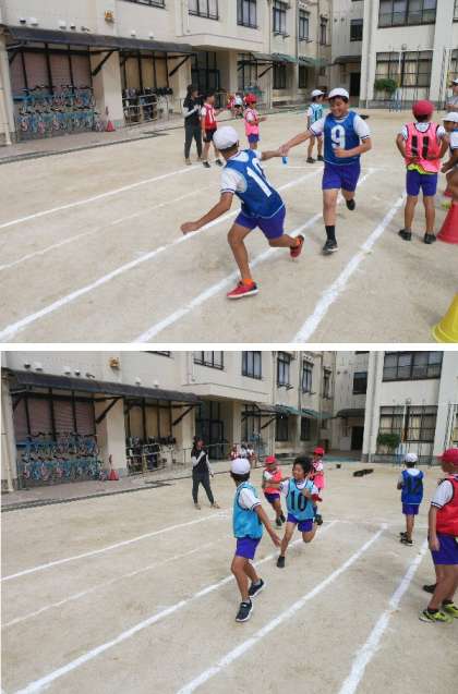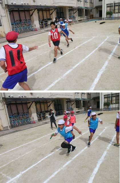 5年生が運動場でリレー競技の練習をしています。やっぱりバトン渡しが迫力です。