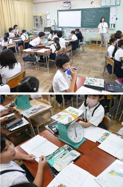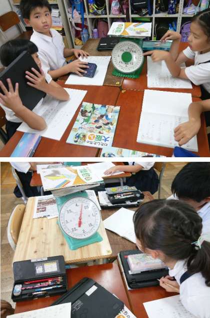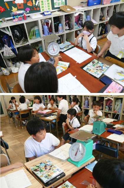 3年生が、はかりを使って重さを量っています。メモリの読み方など、はかりを観察しながら学習しています。