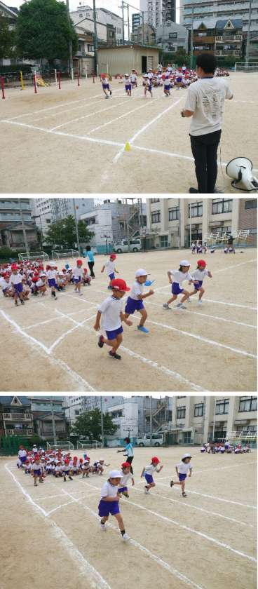 1年生の運動会の練習です。運動場で個人走の練習をしています。「ようい!」で走るかっこになります。少し難しかったけど、頑張って走りました。