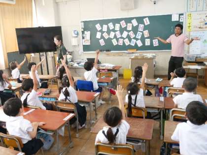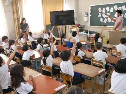 1年生の英語に、ネイティブのトゥリアオ先生が来てくれました。アルファベットを探すゲームをして楽しんで学習していました。
