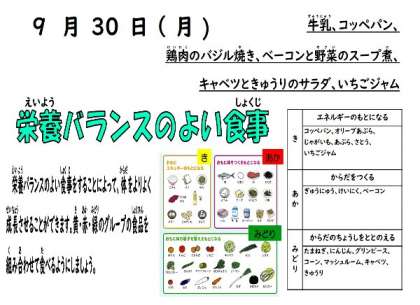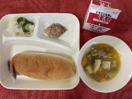 今日の献立は、鶏肉のバジル焼き、ベーコンと野菜のスープ煮、キャベツときゅうりのサラダ、いちごジャム、牛乳、コッペパンでした。