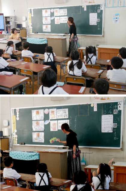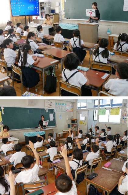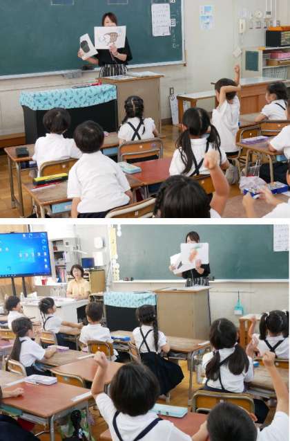 1年生の栄養指導に本校の栄養教諭の先生が授業をしています。からだを作ったり、力の元になったり、体の調子を整える食材についての学習をしていました。まずは、「わたしはだあれ!」と食材をあてるクイズから始まり盛り上がっていました。