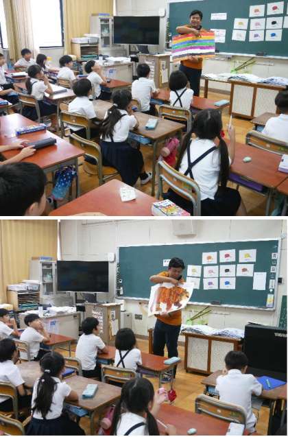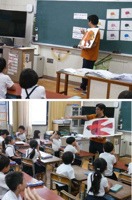 2年生の英語のネイティブのトゥリアオ先生が来てくれました。今日は英語で「何がみえる?」を学習しました。答えは、何色の動物名を答えます。