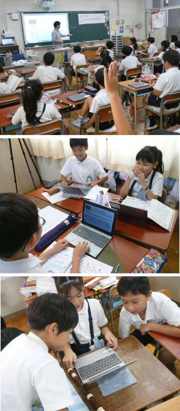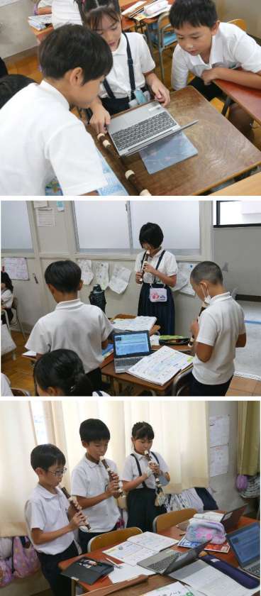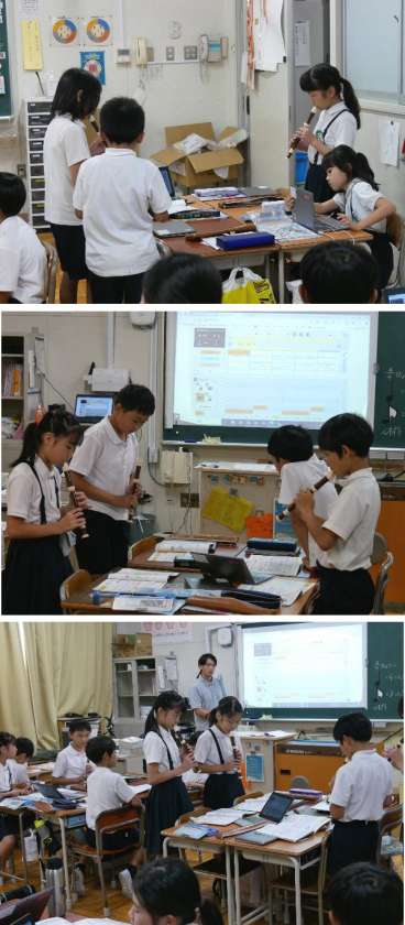 4年生の音楽では、音の動き方を生かして旋律を作っています。パソコンのカフーカというDTMアプリを使って作曲します。班で4小節作って、リコーダで発表しました。