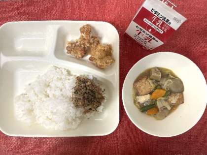 今日の献立は、鶏肉のたつたあげ、あつあげと野菜の煮もの、おかかなっ葉、牛乳、ごはんでした。