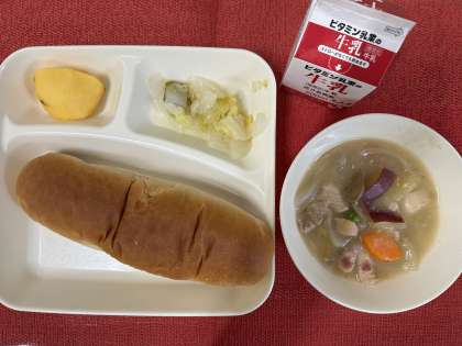 今日の献立は、鶏肉とさつまいものシチュー、白菜のピクルス、柿、牛乳、黒糖パンでした。