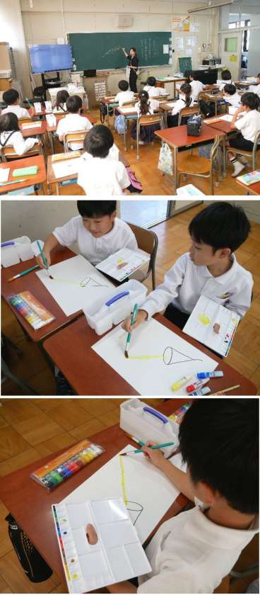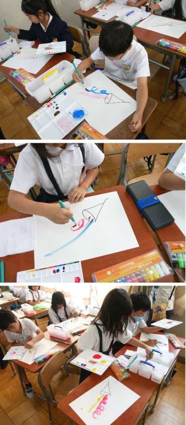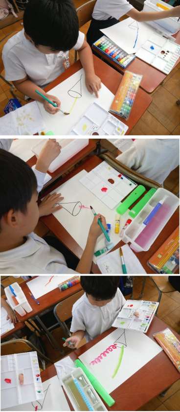 2年生の図工では、絵の具セットをつかって絵を描いてみました。絵の具を水でといて線を描いています。