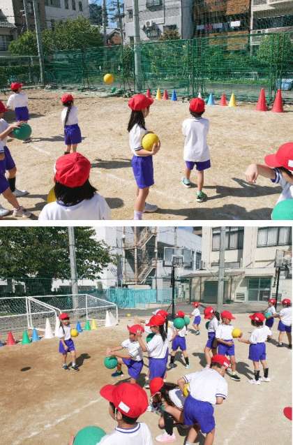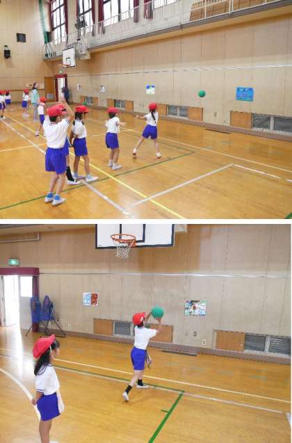 1年生の体育では、片手でボールを投げる練習をしています。ドッヂボールやいろいろなゲームができるようになるといいですね。