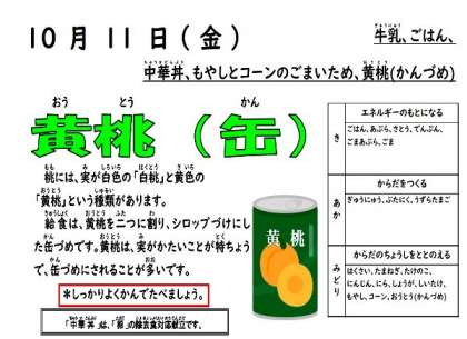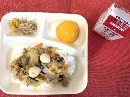 今日の献立は、中華丼、もやしとコーンのごまいため、黄桃(缶詰)、牛乳、ごはんでした。