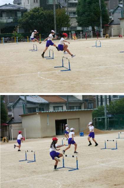 6年生の体育では、ハードル走の練習をしていました。ハードルとハードルの間隔を変えて、走りやすいハードルコースを選んでいます。