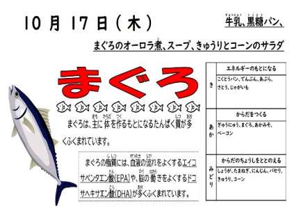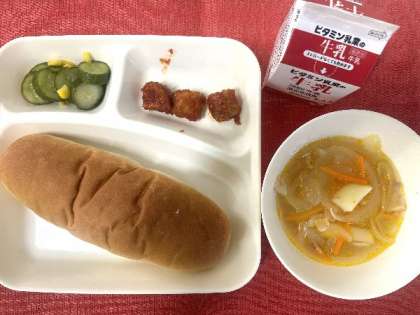 今日の献立は、まぐろのオーロラ煮、スープ、きゅうりとコーンのサラダ、牛乳、黒糖パンでした。