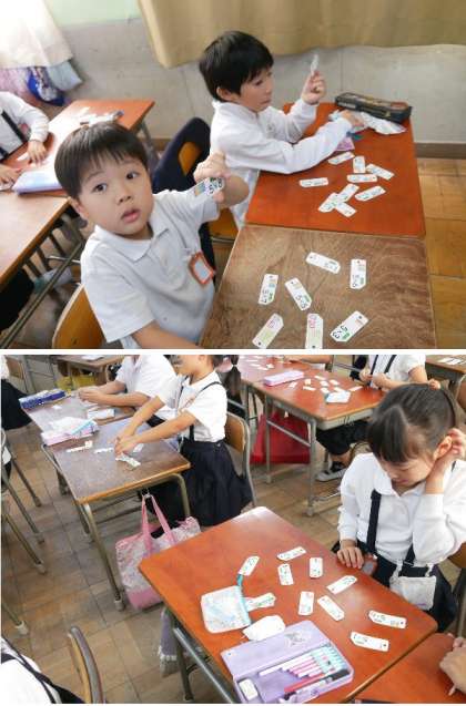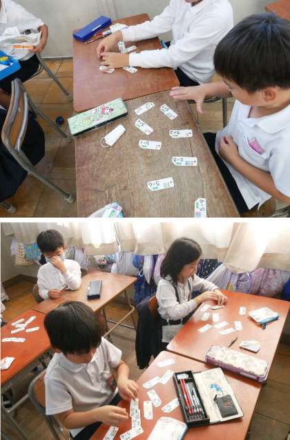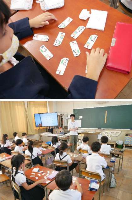 2年生の算数では、九九の学習をしています。九九のカードをつかって、おぼえているか、クイズ形式で確認をしています。