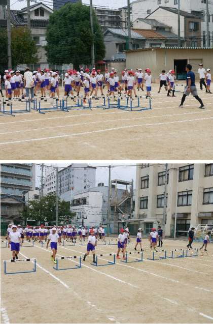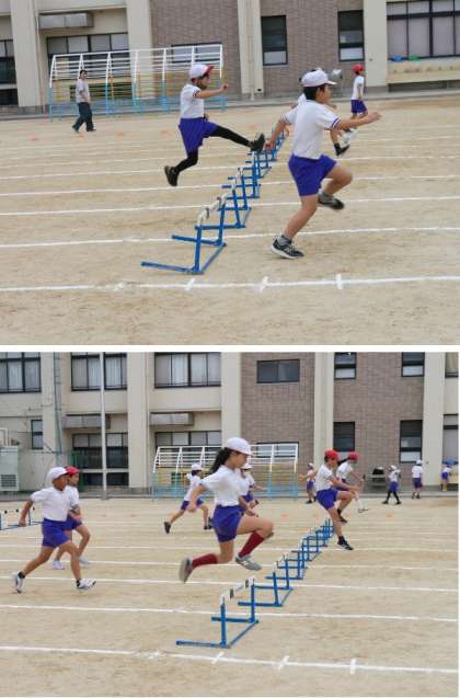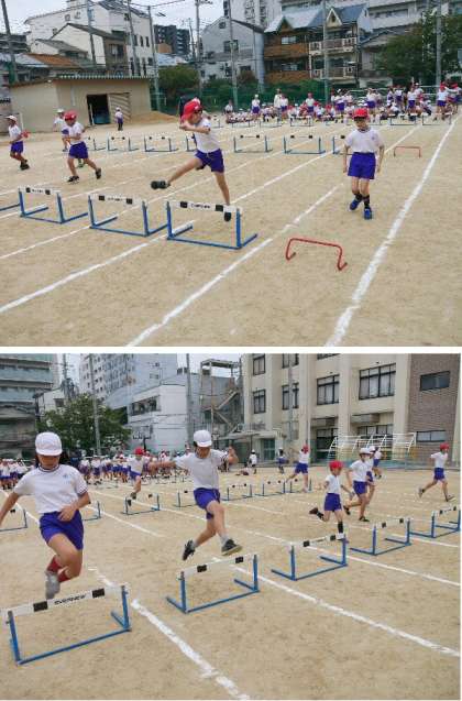 都島区の運動能力向上事業で、講師先生に来ていただき、ハードル走のとび方を教えていただきました。基本のハードルのとび方ですが、なかなか思うように跳べません。丁寧に教えていただきました。