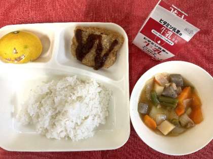 今日の献立は、みそカツ、じゃがいもと野菜の煮もの、牛乳、みかん、ごはんでした。