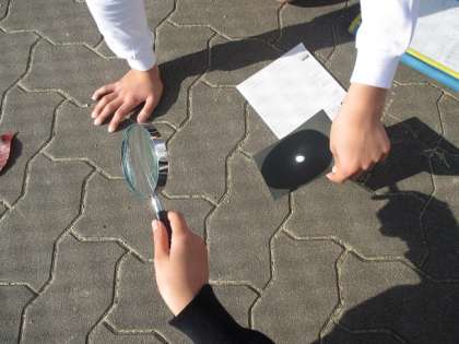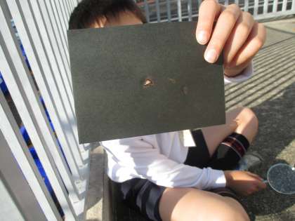 虫眼鏡で光を集めるとどうなるか、という実験です。
