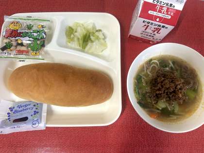 今日の献立は、タンタンめん(肉みそ・汁めん)、あっさりキャベツ、豆こんぶ、ブルーベリージャム、牛乳、コッペパンでした。