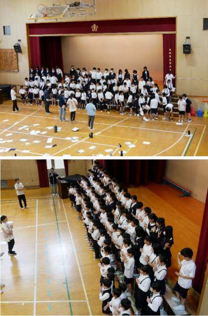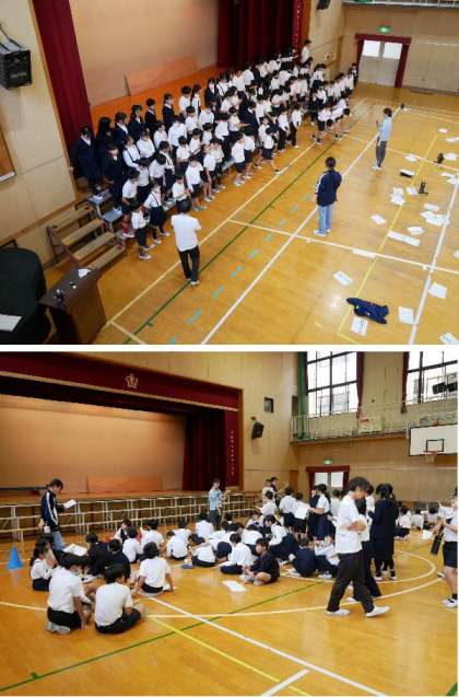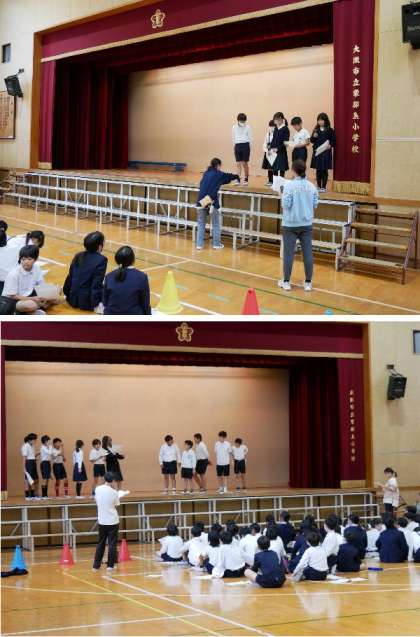 5年生が、講堂で学習発表会の舞台練習をしています。