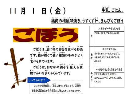 今日の献立は、鶏肉の梅風味焼き、うすくず汁、きんぴらごぼう、牛乳、ごはんでした。