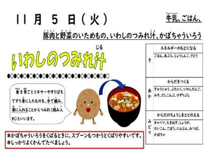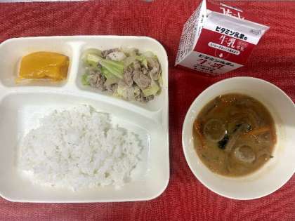 今日の献立は、豚肉と野菜のいためもの、いわしのつみれ汁、かぼちゃういろう、牛乳、ごはんでした。