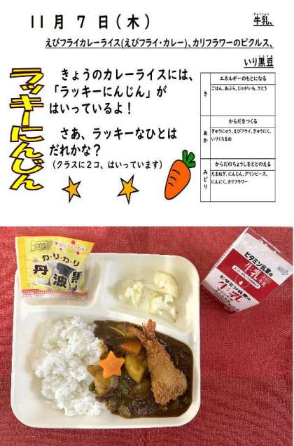 今日の献立は、えびフライカレーライス、カリフラワーのピクルス、いり黒豆、牛乳でした。