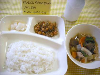 今日の献立は「鶏肉と野菜の煮もの、じゃこ豆、かぶのゆず風味、ごはん、牛乳」です。